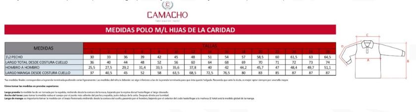 Polo escolar blanco de manga larga, para los uniformes de niño y niña de los Centros Educativos de Hijas de la Caridad. Fabricado por la marca homologada Camacho uniformes escolares en granito de algodón 100% de 220 gramos OEKO-TEX®. El diseño oficial se ha personalizado incorporando en la zona trasera del cuello el logotipo tejido de los colegios Hijas de la Caridad, el cual se repite también en el tejido interior de la tapeta y en el bajo de la prenda. El polo incluye bordado en el pecho izquierdo el logotipo de Hija de la Caridad junto con etiqueta lateral que certifica la autenticidad del modelo.